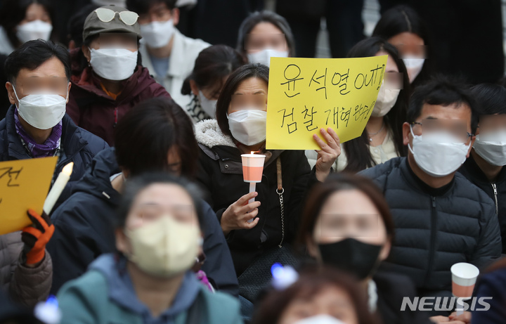 [서울=뉴시스] 고승민 기자 = 26일 서울 청계광장에서 '개혁과전환 촛불행동연대' 주최로 열린 '불법 불통 국민무시 윤석열 규탄 시민촛불' 집회에서 참가 시민들이 피켓과 촛불을 들고 구호를 외치고 있다. 이들은 집회에서 청와대 불법 이전 중단 및 여성가족부 폐지 시도 중단 등을 촉구했다. 2022.03.26. [email protected]