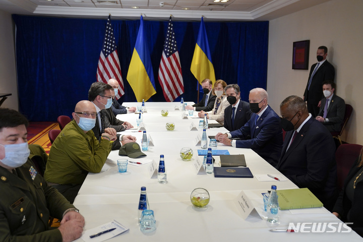 [바르샤바=AP/뉴시스] 26일(현지시간) 폴란드 바르샤바에서 조 바이든 미국 대통령이 앤서니 블링컨 국무장관, 로이드 오스틴 국방장관과 드미트로 쿨레바 우크라이나 외무장관, 올렉시 레스니코프 우크라이나 국방장관 간 2+2 회담에 참석하고 있다. 2022.03.27
