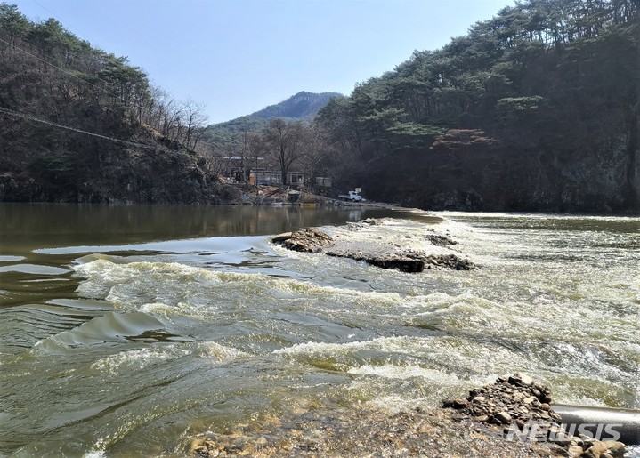 [원주=뉴시스] 이덕화 기자 = 27일 '육지 속 섬 마을'로 불리는 강원 원주시 지정면 간현리 점말마을이 전 날 내린 봄비로 마을로 오가는 다리가 침수되면서 민박 투숙객 100여명이 고립됐다. 2022.03.27. [email protected]