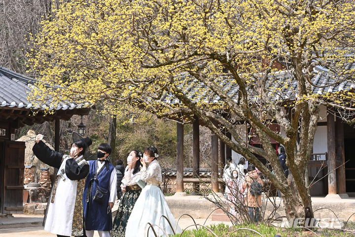[용인=뉴시스] 김종택기자 = 휴일인 27일 오전 경기도 용인 한국민속촌에서 열린 '웰컴 투 조선' 봄 시즌 축제를 찾은 시민들이 활짝 핀 산수유꽃 앞에서 인증샷을 남기고 있다. 2022.03.27. [email protected]