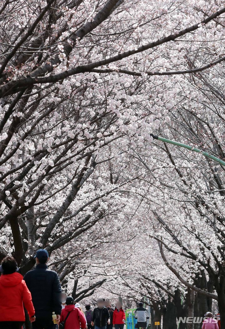 [부산=뉴시스] 하경민 기자 = 봄 기운이 완연한 27일 부산 사상구 삼락생태공원 인근 낙동제방 산책로를 찾은 시민들이 벚꽃터널을 지나며 봄나들이를 즐기고 있다. 부산의 대표적 벚꽃길 중 하나인 낙동제방 벚꽃길은 삼락IC~감전IC 6.4㎞ 구간에 3000여 그루의 아름드리 벚나무가 터널을 이루고 있다. 2022.03.27. [email protected]