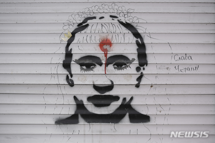 [스토얀카=AP/뉴시스] 27일(현지시간) 우크라이나 스토얀카에서 러시아와의 전투로 피해를 본 한 상점 철문에 블라디미르 푸틴 러시아 대통령을 묘사한 낙서와 '우크라이나에 영광'이라는 문구가 쓰여 있다. 2022.03.28.