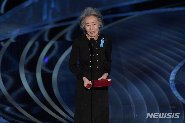 [로스앤젤레스=AP/뉴시스] 윤여정이 27일(현지시간) 미 캘리포니아주 로스앤젤레스의 돌비극장에서 열린 제94회 아카데미 시상식에서 최우수 남우 조연상을 시상하고 있다. 2022.03.28.