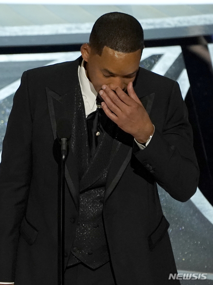 [로스앤젤레스=AP/뉴시스] 배우 윌 스미스가 27일(현지시간) 미 캘리포니아주 로스앤젤레스의 돌비극장에서 열린 제94회 아카데미 시상식에서 영화 '킹 리처드'(King Richard)로 남우 주연상을 받은 후 눈물을 흘리고 있다. 2022.03.28.