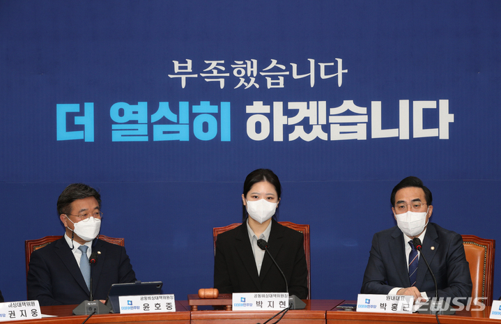 [서울=뉴시스] 김선웅 기자 = 박지현 더불어민주당 공동비상대책위원장이 28일 오전 서울 여의도 국회에서 열린 비상대책위원회의에서 발언하고 있다. (공동취재사진) 2022.03.28 [email protected]