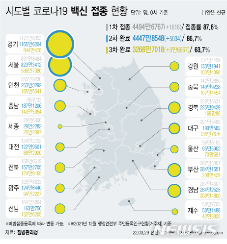 [서울=뉴시스] 29일 코로나19 예방접종 대응 추진단에 따르면 시도별 누적 3차 접종자 수는 경기도가 844만478명으로 가장 많고, 이어 서울 588만7380명, 경남 208만4800명, 부산 208만429명 등이다. 지역별로 3차 접종률이 높은 곳은 전남 72.6%로 가장 높다. (그래픽=전진우 기자)