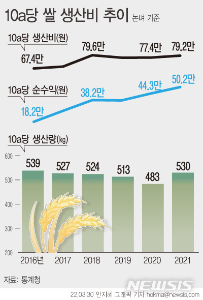 [서울=뉴시스] 30일 통계청에 따르면 지난해 10a(아르·1000㎡)당 논벼(쌀) 총수입은 129만4243원으로 전년보다 7만7995원(6.4%) 증가했다. 총수입에서 생산비를 뺀 10a당 순이익은 50만1978원으로 전년보다 13.4%(5만9387원)이나 증가했다. 이는 지난 2001년(51만1593원) 이래 20년 만에 최대다. (그래픽=안지혜 기자)