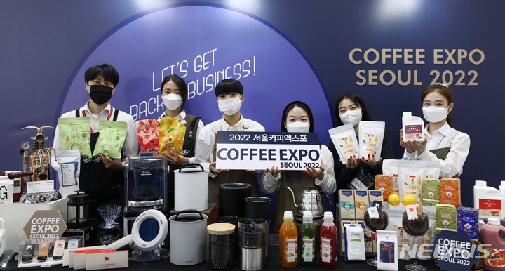 [서울=뉴시스] 이영환 기자 = 30일 오전 서울 강남구 코엑스에서 열린 2022 서울커피엑스포에서 참가 업체 관계자들이 다양한 제품들을 소개하고 있다. 2022 서울커피엑스포는 이날부터 4월 2일까지 코엑스에서 열린다. 2022.03.30. [email protected]