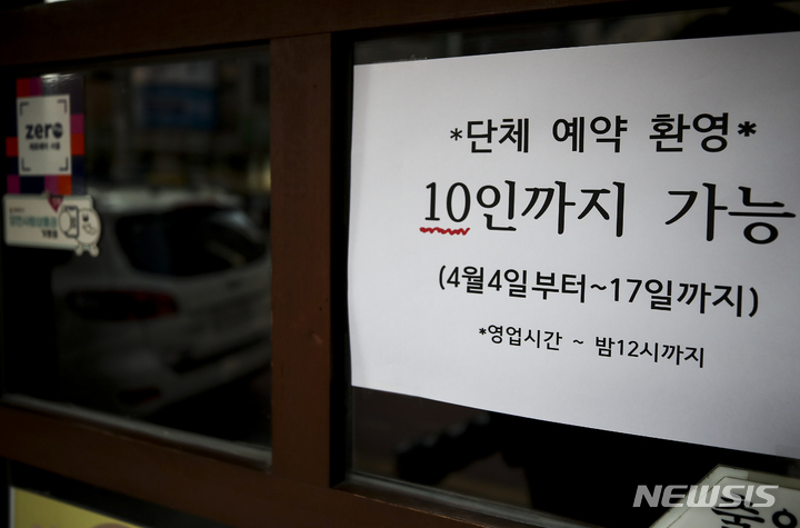 [서울=뉴시스] 정병혁 기자 = 10명·12시로 완화된 사회적 거리두기 시행 하루 전인 3일 서울시내 한 음식점에 거리두기 관련 안내문이 붙어 있다. 2022.04.03. [email protected]