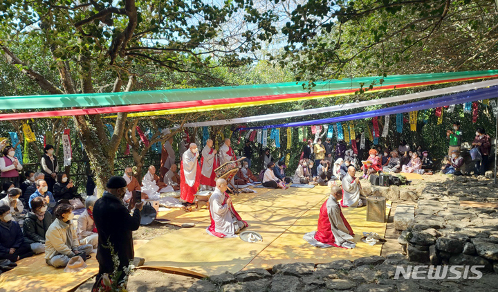 [구례=뉴시스] 전남 구례군 마산면 화엄사 구충암 일대에서 3일 오전 국태민안과 코로나19 종식, 우크라이나 평화기원 지리산 봉천 산신제가 열리고 있다. 산신제는 매년 음력 3월 3일에 열린다. (사진=구례 화엄사 제공). 2022.04.03. [email protected]