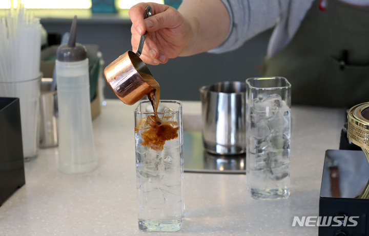 [서울=뉴시스] 이영환 기자 = 카페와 식당 등 매장 내 일회용품 사용 제한이 시행중인 3일 오후 서울 시내의 한 카페에서 직원이 유리잔에 음료를 제공하고 있다. 정부는 당분간 단속에 나서기보다 계도에 집중하겠다는 계획인데 업주와 시민들 사이에서는 긍정적 평가와 불만이 동시에 나오고 있다. 2022.04.03. [email protected]