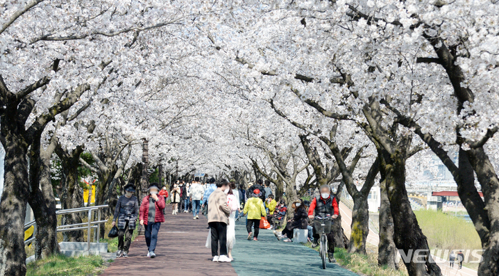 [남원=뉴시스] 김얼 기자 = 완연한 봄 날씨가 이어지고 있는 3일 전북 남원시 요천로를 찾은 시민과 관광객들이 만개한 벚꽃을 바라보며 산책을 즐기고 있다. 2022.04.03. [email protected]