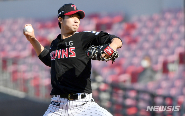 [광주=뉴시스] 류형근 기자 = 3일 오후 광주 북구 광주-기아챔피언스필드에서 열린 2022프로야구 KIA 타이거즈 대 LG 트윈스의 경기, 5회말 2사에서 LG 바뀐투수 이정용이 역투하고 있다. 2022.04.03. [email protected]