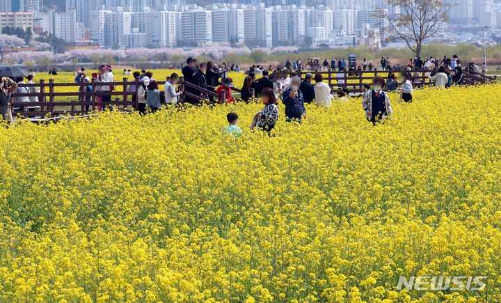 [부산=뉴시스] 하경민 기자 = 부산지역 낮 최고기온이 17도를 기록한 3일 강서구 대저생태공원에 조성된 유채꽃밭을 찾은 상춘객들이 봄 나들이를 즐기고 있다. 부산시는 올해 '낙동강 유채꽃 축제' 개최를 취소했지만, 꽃이 핀 현장은 누구나 자유롭게 입장해 꽃놀이를 즐길 수 있도록 하고 있다. 2022.04.03. [email protected]