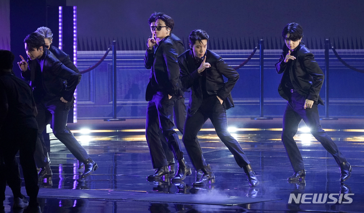 [라스베이거스=AP/뉴시스] 그룹 방탄소년단(BTS)이 3일(현지시간) 미 네바다주 라스베이거스의 MGM 그랜드 가든 아레나에서 열린 제64회 그래미 시상식에 참석해 '버터' 공연을 펼치고 있다. 2022.04.04.