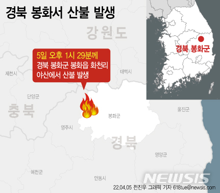 [서울=뉴시스] 5일 오후 1시29분께 경북 봉화군 봉화읍 화천리의 한 야산에서 화재가 발생했다. 산림 당국은 오후 2시50분 기준 산불 2단계를 발령하고 대원 150여명과 헬기 17대 등을 투입해 진화 작업을 벌이고 있다. (그래픽=전진우 기자)