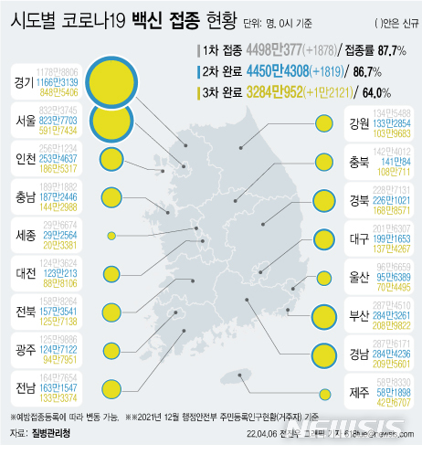 [서울=뉴시스] 6일 코로나19 예방접종 대응 추진단에 따르면 시도별 누적 3차 접종자 수는 경기도가 848만5406명으로 가장 많고, 이어 서울 591만7434명, 경남 209만5601명, 부산 208만9822명 등이다. 지역별로 3차 접종률이 높은 곳은 전남 73%로 가장 높다. (그래픽=전진우 기자)