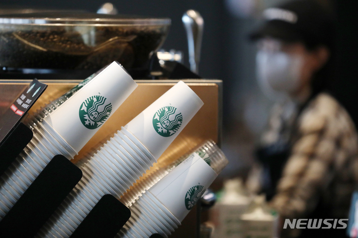 [서울=뉴시스] 조성우 기자 = 지난해 6월 자원재활용법 개정에 따라 올해 6월 10일부터 일회용 컵 보증금제가 시행된다. 소비자는 보증금제 적용 매장에서 재활용 라벨이 붙은 일회용 컵에 담긴 음료를 살 때 보증금 300원을 내고, 다 쓴 컵을 반납하면 되돌려 받는다. 6일 오전 서울 시내 한 프랜차이즈 커피 전문점에 일회용 컵이 놓여있다. 2022.04.06. [email protected]