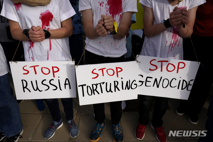 [니코시아=AP/뉴시스] 7일(현지시간) 키프로스 니코시아에서 양손을 묶은 우크라이나 사람들이 러시아 규탄 시위를 하고 있다. 이날 볼로디미르 젤렌스키 우크라이나 대통령은 키프로스 의회 화상 연설을 했다. 2022.04.08.