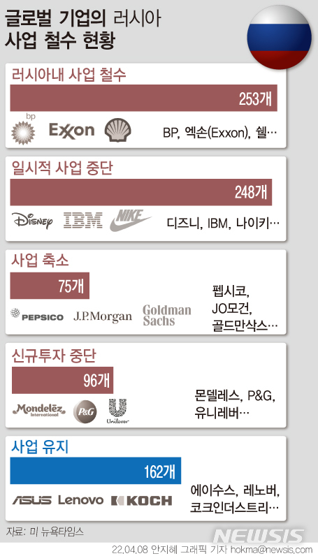 [서울=뉴시스] 최근 6주 동안 민간기업들이 강력하게 러시아를 압박하고 있다. 7일(현지시간) 미 뉴욕타임스에 기고된 예일 경영대학원 소속 24명의 연구자들 조사에 따르면 미국 기업 수백곳이 자발적으로 러시아내 사업을 축소 또는 중단했다. 162개 기업들은 기존 사업이나 투자에 변동이 있을 것이라고 발표하지 않았다. (그래픽=안지혜 기자)