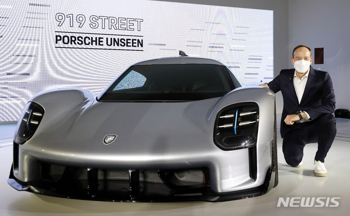 [서울=뉴시스] 백동현 기자 = 홀가 게어만 포르쉐코리아 대표가 8일 오전 서울 중구 동대문디자인플라자에서 열린 '포르쉐 이코넨, 서울'에 참석해 아시아 최초로 공개되는 고성능 하이퍼카 콘셉트 모델 '919 스트리트' 옆에서 기념촬영하고 있다. 2022.04.08. [email protected]