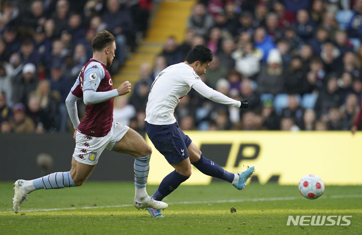 [버밍엄=AP/뉴시스] 토트넘 홋스퍼의 손흥민(오른쪽)이 9일(현지시간) 영국 버밍엄의 빌라파크에서 열린 애스턴 빌라와의 2021~22시즌 잉글랜드 프리미어리그 32라운드 경기에 선발 출전해 득점하고 있다. 손흥민은 해트트릭을 기록하며 팀의 4-0 승리를 이끌었다. 2022.04.10.