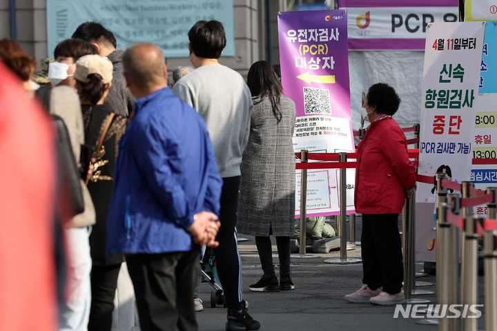 [서울=뉴시스] 백동현 기자 = 코로나19 신규 확진자가 16만4481명으로 집계된 10일 오전 서울 중구 서울역광장에 마련된 임시선별검사소에서 시민들이 검사를 받기 위해 대기하고 있다. 2022.04.10. [email protected]