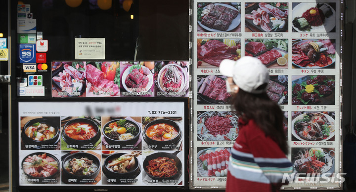 [서울=뉴시스] 김선웅 기자 = 재료비와 배달료 인상, 수요 회복이 맞물리면서 외식 물가가 1년 새 6.6% 상승했다. 햄버거와 김밥, 짜장면 등을 포함해 39개 외식 조사 품목의 물가가 모두 상승했다. 10일 국가통계포털에 따르면 지난달 외식 물가는 1년 전보다 6.6% 올랐으며 이는 1998년 4월 이후 23년 11개월 만에 가장 상승폭이 큰 것이다. 10일 서울 시민들이 서울 시내 한 식당가 앞을 지나고 있다. 2022.04.10. [email protected]