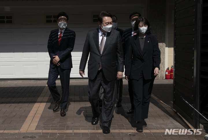 [대구=뉴시스] 인수위사진기자단 = 윤석열 대통령 당선인이 12일 오후 박근혜 전 대통령 예방을 마친 뒤 대구 달성군 유가읍 박 전 대통령 사저를 나오고 있다. 2022.04.12. [email protected]