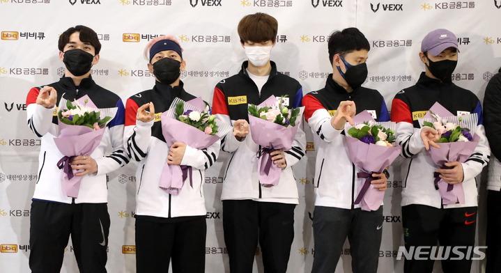 [인천공항=뉴시스] 추상철 기자 = 세계선수권대회을 마친 남자 쇼트트랙 대표팀 선수들이 12일 오후 인천국제공항을 통해 귀국한 후 꽃다발을 들고 기념촬영을 하고 있다. 2022.04.12. [email protected]