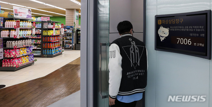 [서울=뉴시스] 권창회 기자 = 13일 오후 서울 광진구 GS더프레시 광진화양점에서 고객이 은행업무를 보고 있다. GS리테일은 신한은행과 협력해 광진화양점을 '디지털혁신점포 1호점'으로 탈바꿈했다. 기존 ATM보다 고도화된 디지털 데스크와 스마트 키오스크 등을 설치해 예금, 적금, 대출 등 다양한 창구 업무를 80% 이상 처리할 수 있다. 2022.04.13. [email protected]