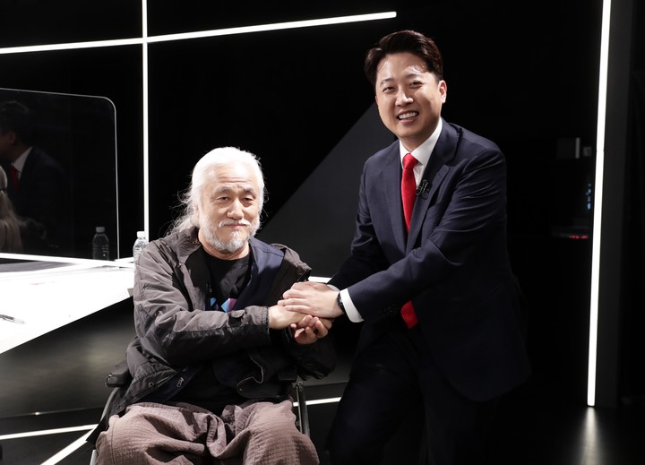 [서울=뉴시스] 사진공동취재단 = 이준석(오른쪽) 국민의힘 대표와 박경석전국장애인차별철폐연대 상임공동대표가 13일 오후 서울 마포구 상암동 JTBC프로그램 ‘썰전라이브’ 생방송 토론에 앞서 기념촬영을 하고 있다. 2022.04.13. [email protected]