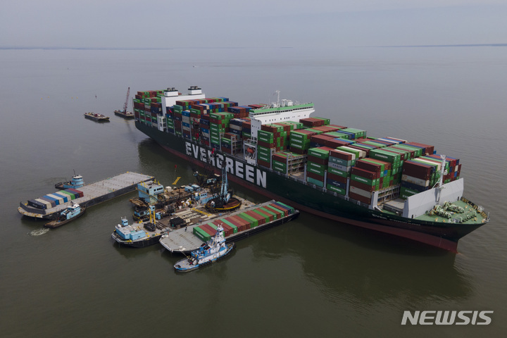 [볼티모어=AP/뉴시스] 13일(현지시간) 미 메릴랜드주 볼티모어 인근 체서피크만에 좌초 중인 컨테이너선 에버 포워드의 무게를 줄이기 위해 화물을 바지선으로 옮기고 있다. 지난달 13일 좌초된 이 선박은 삼성중공업이 2020년 9월 28일 대만 에버그린에 인도한 334m 길이의 컨테이너선이다. 2022.04.14.