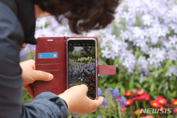 [서울=뉴시스] 권창회 기자 = 미세먼지 농도가 '좋음'을 보인 14일 오후 서울 용산구 남산공원에서 한 시민이 형형색색 피어있는 꽃들을 찍고 있다. 2022.04.14. [email protected]