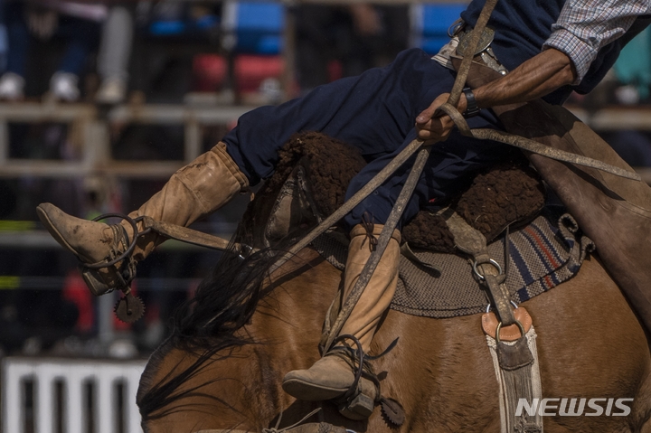 [몬테비데오=AP/뉴시스] 14일(현지시간) 우루과이 몬테비데오에서 '끄리오야(Criolla) 주간' 기념 로데오 경기가 열려 카우보이 '가우초'가 야생마를 부리고 있다. 1925년부터 매년 부활절 전에 열리는 이 로데오에 '가우초'들이 모여 야생마 길들이기 경쟁을 펼친다. 2022.04.15.