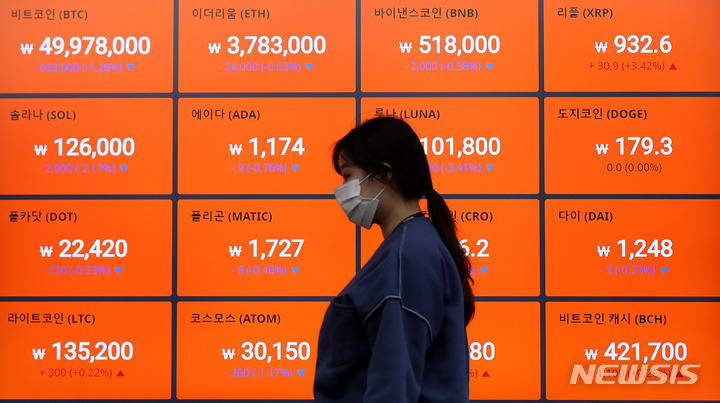 [서울=뉴시스] 추상철 기자 = 비트코인이 5000만원 아래로 하락한 15일 오전 서울 서초구 빗썸고객지원센터 전광판에 비트코인을 비롯한 암호화폐 시세가 나타나고 있다. 2022.04.15. [email protected]