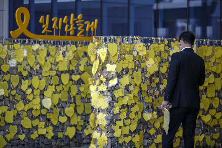 [안산=뉴시스] 정병혁 기자 = 세월호 참사 8주기인 16일 오후 경기 안산시 4.16민주시민교육원에 마련된 단원고 4.16 기억교실을 찾은 시민이 희생자들에게 보내는 문구를 살펴보고 있다. 2022.04.16. [email protected]