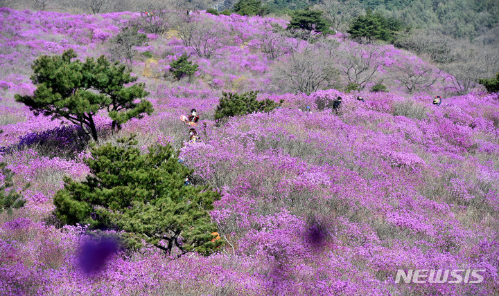 [대구=뉴시스] 이무열 기자 = 17일 대구 달성군 유가읍 비슬산 참꽃 군락지가 분홍빛으로 물들어 가고 있다. 달성군은 코로나19 확산 방지를 위해 올해 열기로 한 제26회 비슬산 참꽃 문화제를 취소했다. 2022.04.17. [email protected]