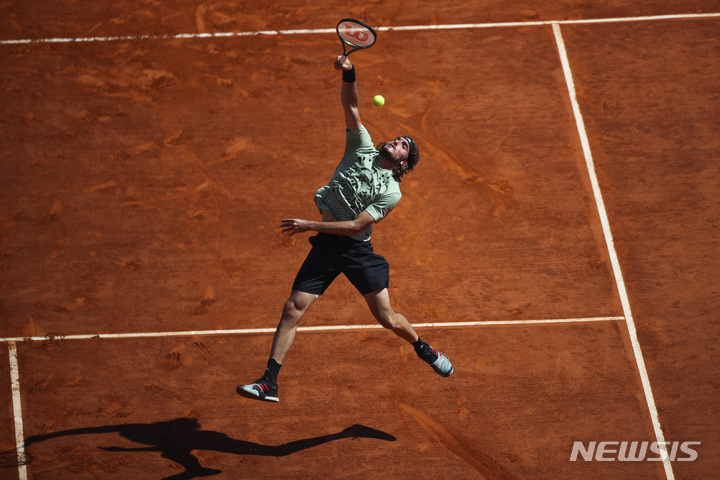 [몬테카를로=AP/뉴시스] 스테파노스 치치파스(5위·그리스)가 17일(현지시간) 모나코 몬테카를로의 레이니어 3세 코트에서 열린 ATP1000 대회 ‘2022 롤렉스 몬테카를로 마스터스’ 결승전에서 알레한드로 다비노비치 포키나(46위·스페인)와 경기하고 있다. 치치파스는 포키나를 세트 스코어 2-0(6-3 7-6<3>)으로 물리치고 2연패를 기록했다. 2022.04.18.
