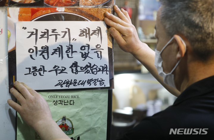 [서울=뉴시스] 고승민 기자 = 사적 모임과 행사, 집회 인원 제한이 모두 풀리고 식당, 카페, 술집 영업이 24시간 가능해진 18일 서울의 한 음식점에서 사장이 '거리두기 해제, 인원제한 없음, 그동안 수고 많으셨습니다'라고 쓴 안내문을 부착하고 있다. 2022.04.18. [email protected]