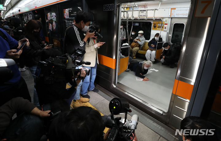 [서울=뉴시스] 이영환 기자 = 박경석 전국장애인차별철폐연대(전장연) 공동대표와 회원들이 21일 서울 종로구 지하철3호선 경복궁역에서 '출근길 지하철 타기' 시위를 하고 있다. 전장연에 따르면 시위는 이날 오전 7시부터 서울 지하철 3호선 경복궁역, 2호선 시청역, 5호선 광화문역 등 3곳에서 동시 진행된다.  2022.04.21. [email protected]
