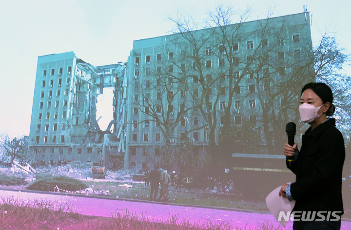 [서울=뉴시스] 최진석 기자 = 분쟁지역 전문 김영미PD가 22일 오전 국회 의원회관에서 열린 '우크라이나-러시아 전쟁 긴급 현지 상황 보고 간담회' 에 참석해 우크라이나 상황을 설명하고 있다. (공동취재사진) 2022.04.22 [email protected]