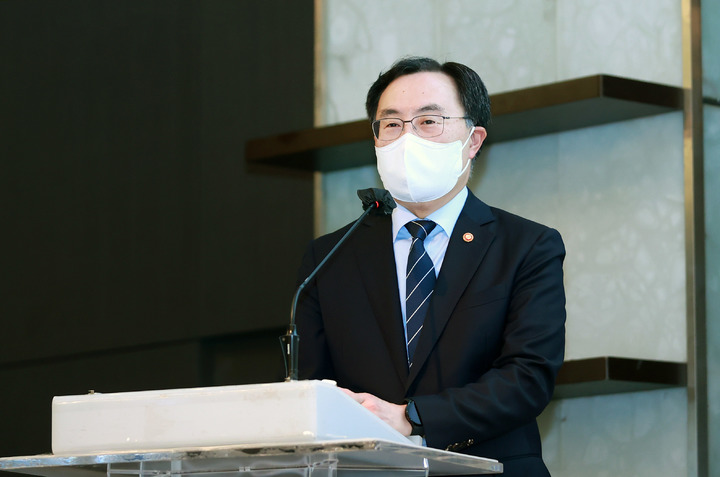 [서울=뉴시스] 배훈식 기자 = 문승욱 산업통상자원부 장관이 22일 오후 서울 중구 더플라자호텔에서 열린 제22회 상생포럼 IR비즈니스 포럼에 참석해 글로벌 산업의 3대 트렌드와 정책방향을 주재로 특별강연을 하고 있다.(사진=산업통상자원부 제공) 2022.04.22. [email protected] *재판매 및 DB 금지