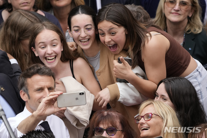 [피작=AP/뉴시스] 재선을 노리는 중도 성향의 에마뉘엘 마크롱 프랑스 대통령이 22일(현지시간) 프랑스 남서부 피작에서 유세를 마친 뒤 젊은이들과 셀카를 찍고 있다. 마크롱 후보는 오는 24일 마린 르펜 후보와 대선 결선투표를 치른다. 2022.04.23.