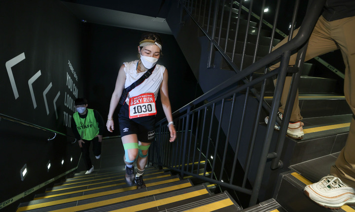 [서울=뉴시스] 이영환 기자 = 23일 오전 서울 송파구 롯데월드타워에서 열린 수직마라톤 대회 '2022 스카이런(SKY RUN)'에서 1030번 참가자가 결승선을 향해가고 있다. 이 참가자는 30분 57초의 기록으로 완주했다. 2017년 처음 개최된 이 행사는 코로나로 인해 중단 됐다가 3년만에 진행됐다. 2022.04.23.(공동취재사진) [email protected]