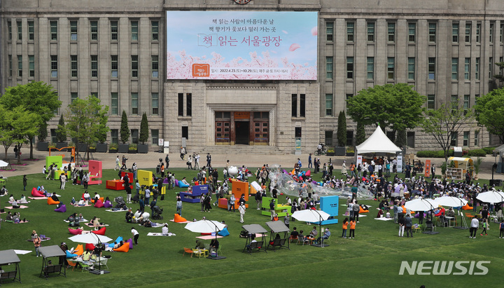[서울=뉴시스] 이영환 기자 = 23일 오전 서울 중구 서울광장에서 열린 '책 읽는 서울광장'을 찾은 시민들이 책을 읽으며 즐거운 시간을 보내고 있다. '책 읽는 서울광장'은 서울광장을 서울도서관과 연계해 시민 누구나 자유롭게 책과 쉼, 문화를 누릴 수 있게 한 도심 속 열린 야외 도서관이다. 10월 말까지 매주 금·토요일 오전 11시부터 오후 4시까지 운영한다. 2022.04.23. [email protected]