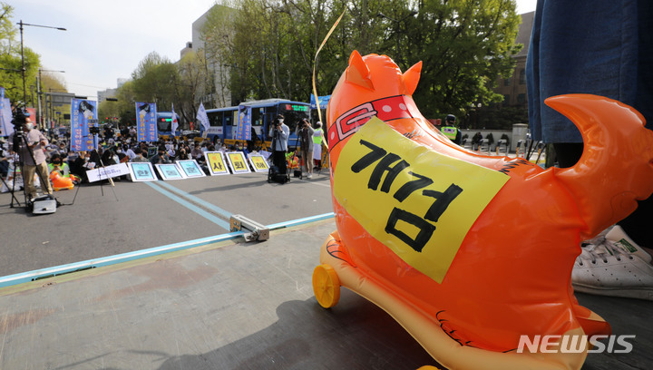 [서울=뉴시스] 권창회 기자 = 23일 오후 서울 종로구 마로니에 공원에서 열린 '한동훈-정호영 지명 철회! 김건희 구속 처벌! 촛불시민 대행진 집회'에서 강아지 풍선에 검찰을 규탄하는 뜻의 '개검'이 적혀 있다. 2022.04.23. [email protected]