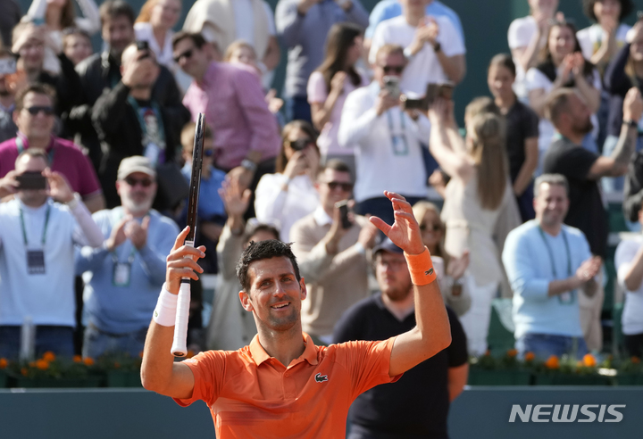 [베오그라드=AP/뉴시스] 노바크 조코비치(1위·세르비아)가 23일(현지시간) 세르비아 베오그라드에서 열린 ATP250 세르비아 오픈 준결승전에서 카렌 하차노프(26위·러시아)를 물리치고 기뻐하고 있다. 조코비치는 하차노프를 세트 스코어 2-1(4-6 6-1 6-2)로 꺾고 결승에 올라 안드레이 루블레프(8위·러시아)와 우승을 다툰다. 2022.04.24.
