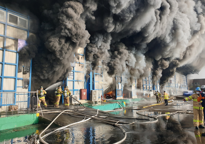 [서울=뉴시스] 백동현 기자 = 24일 오전 경남 창원시 한 자동차부품 생산공장에 큰불이 나 소방당국은 대응 2단계를 발령해 진화에 총력을 기울이고 있다고 밝혔다. (사진=소방청 제공) 2022.04.24. [email protected] *재판매 및 DB 금지
