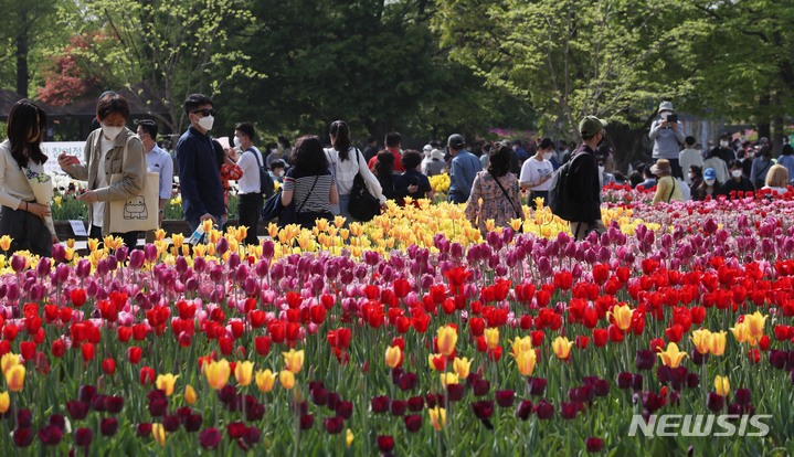 [고양=뉴시스] 조수정 기자 = 사회적 거리두기 전면 해제 첫 일요일인 24일 경기 고양시 일산호수공원에서 열린 고양국제꽃박람회에 많은 상춘객들이 봄을 즐기고 있다. 2022.04.24. [email protected]